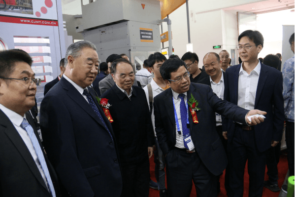 陳吉紅董事長向中國機械工業聯合會王瑞祥會長、中國機床工具工業協會常務副理事長毛予鋒、中國工程院原院長周濟院士等來訪貴賓介紹華中數控最新產品及技術