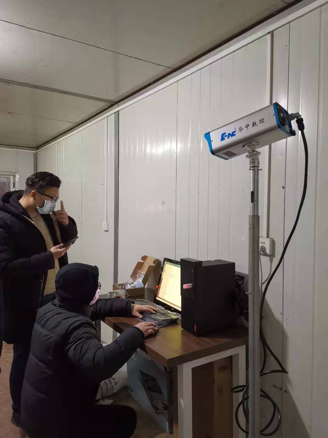 1月27日,正月初四下午,華中數控數控系統事業部副總經理岳應超和3位工程師緊急出發趕往雷神山醫院,負責“紅外熱成像智能體溫檢測系統”安裝調試。趕到雷神山醫院后,設備安裝調試工作一直持續到晚上十一點。1月28日早上,岳應超等人繼續開展紅外設備操作方法等現場指導工作,設備投入正式使用。